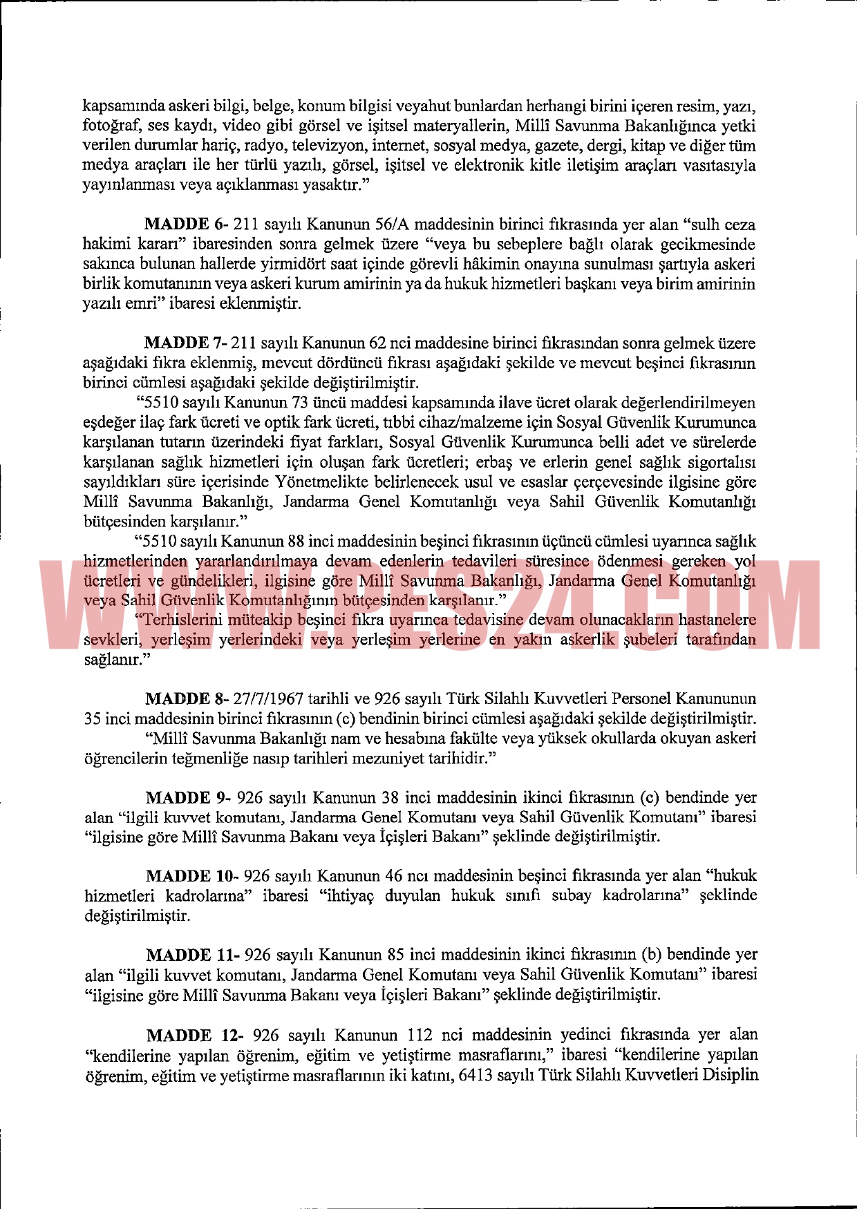 Türk Silahlı Kuvvetleri personelinin kimlik, görev veya faaliyetlerinin, Milli Savunma Bakanlığınca yetki verilen durumlar hariç olmak üzere, radyo, televizyon, internet, sosyal medya, gazete, dergi, kitap ve diğer tüm medya araçları ile her türlü yazılı, görsel, işitsel ve elektronik kitle iletişim araçları vasıtasıyla yayımlanması veya açıklanması durumunda, bu suçu işleyen personele “hizmet yerini terk etmeme cezası” verilecek.