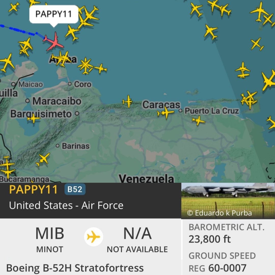 ABD’nin B-52 bombardıman uçağı Maduro’nun terörist ilan edilmesinin ardından Venezuela kıyısına yakın uçtu. Boşaltılan hava sahasında uçan tek uçak oldu. Venezuela açıklarında ABD donanması ve binlerce asker hazır beklerken Trump, terörist ilan ettiği liderle görüşmeye hazırlanıyor.