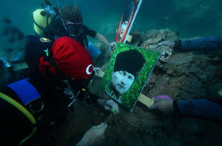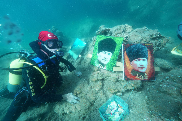 Cumhuriyet’in kuruluşunun 102. yıl dönümü dolayısıyla su altında özel ekipmanlarla Atatürk portreleri boyandı. Emekli koramiral ressam Ekmel Totrakan, İzmir’in Çeşme ilçesi açıklarında dalış eğitmenleri Erdinç Ergün, Murat Kulakaç, Öztan Sönmez ve su altı belgesel yapımcısı ve görüntü yönetmeni Tahsin Ceylan ile dalış yaptı. Ressam Mustafa Ali Kasap’ın çizdiği 3 Atatürk portresini de yanına alan Totrakan, su altında spatula ve suda dağılmayan, deniz ekosistemine zarar vermeyen özel boyalarla portreleri renklendirdi.