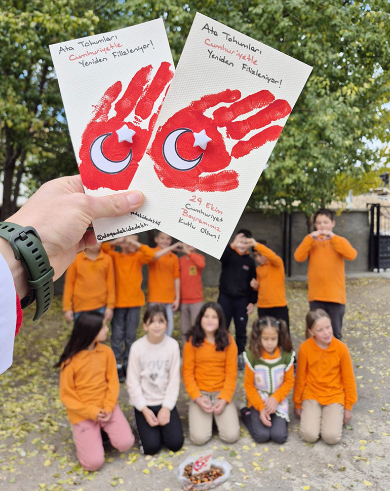 Konya’da ilkokul öğrencileri, 29 Ekim Cumhuriyet Bayramı etkinliklerinde Hakkari’de kardeş okuldaki arkadaşlarına içerisinde meşe palamudu tohumu bulunan 102 kutlama kartı gönderdi. Konya’da Ilgın Çiğil Kazım Karabekir İlkokulu sınıf öğretmeni Rabiye Kılınçarslan ile öğrencileri, 29 Ekim Cumhuriyet Bayramı etkinliklerinde, Hakkari’deki kardeş okulları Yüksekova Hamit Kesici İlkokulu’ndaki öğrencileri tohum gönderdi. Cumhuriyet Bayramı’na özel kutlama kartları hazırlayan öğrenciler, kartlara 102 meşe palamudu tohumu bıraktı. Rabiye Kılınçarslan, “Öğrencilerimle gönderdiğimiz Cumhuriyet kartları ellerine ulaşan çocuklar tohumları toprakla buluşturacak. Filizlenen meşe palamutlarının ilkbahar aylarında Hakkari TEMA ortaklığı ile ormanlara dikimi yapılacak. Meşe palamutları Cumhuriyet Bayramı’nda, çocukların elleriyle filizlenecek. Cumhuriyetimizin 102. yılı kutlu olsun” dedi.