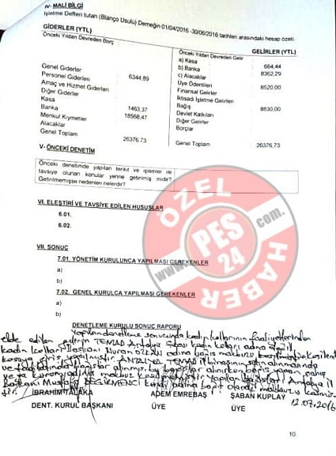 “Yapılan denetleme sonucunda kadın kollarının faaliyetlerinden elde edilen gelirin, Temad Antalya Şubesi kadın kolları adına değil, Kadın Kolları Başkanı Nural ÖZKAN adına bağış makbuzu kesilerek, kasaya giriş yapılmıştır.” ifadeleri mevcut.
