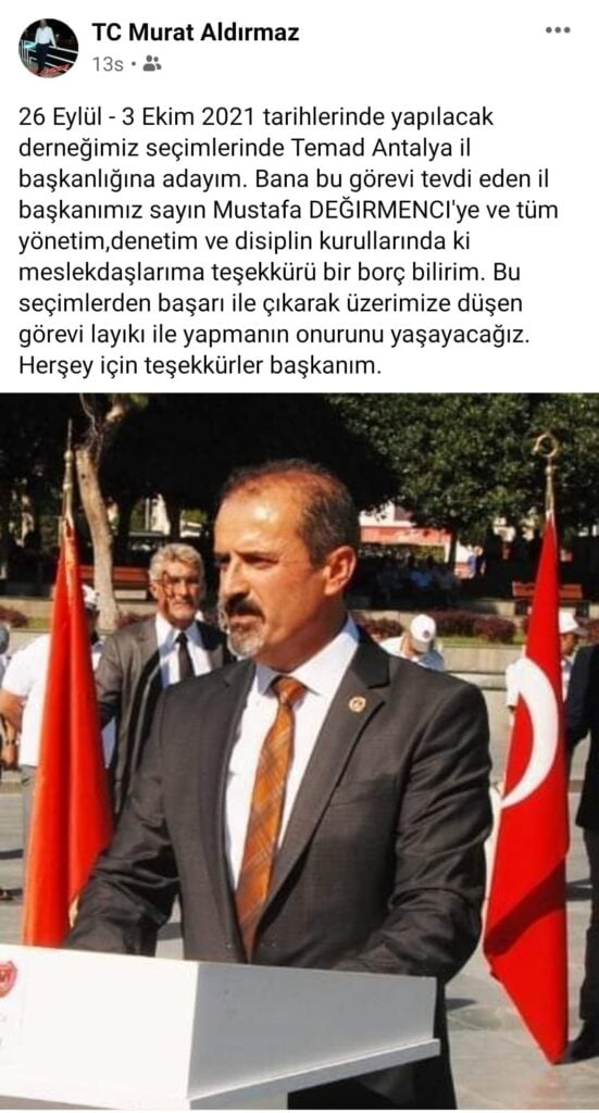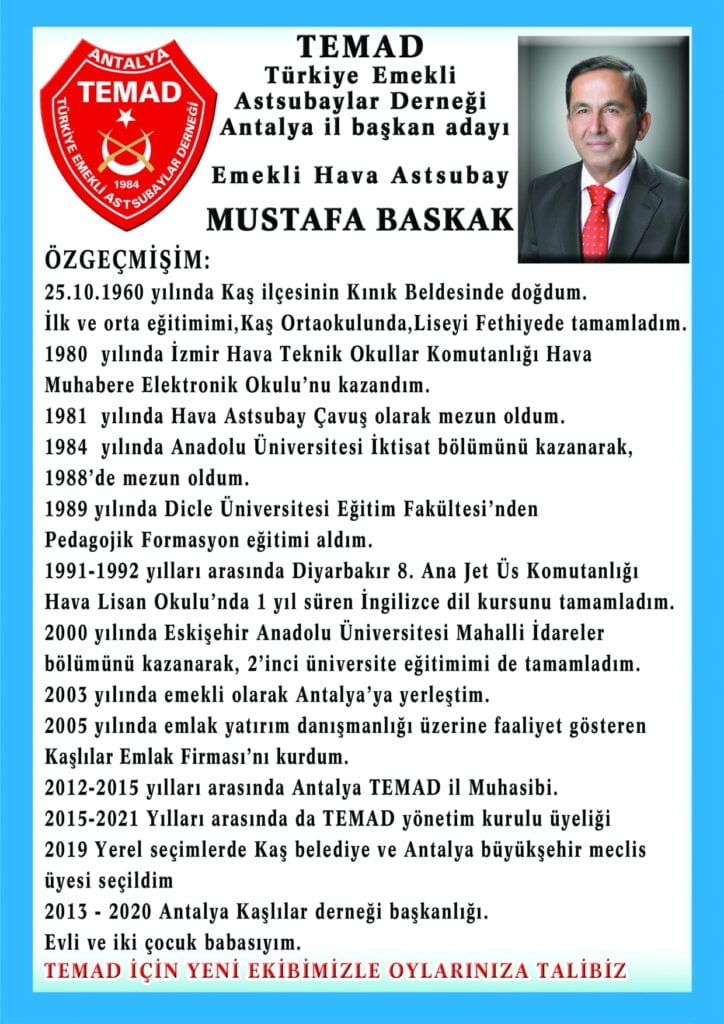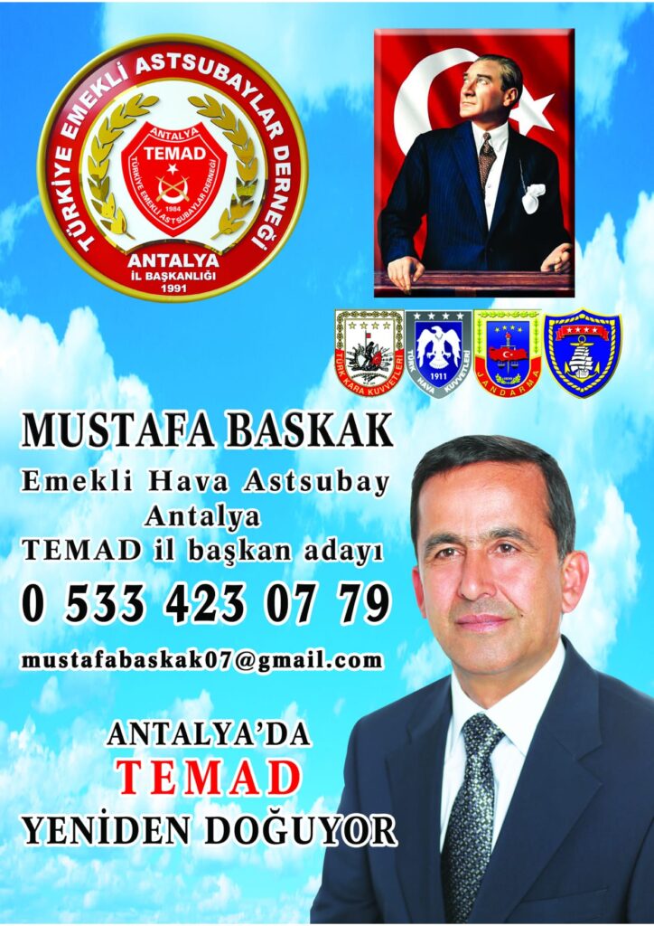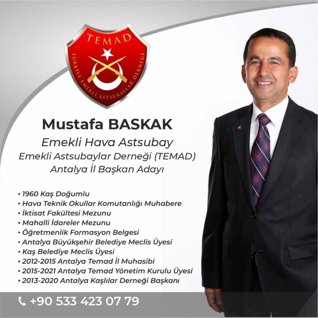 Seçimde en güçlü ve desteklenen aday olarak Emekli Hava Astsubay Mustafa BASKAK’ın ismi öne çıktı.  Önceki yönetİmde de görev alan BASKAK, değişim için çalışmalarına hız verdi. Yaklaşık 9 yıldır ve 3 dönem Antalya TEMAD Başkanlığı yapan Mustafa Değirmenci geçtiğimiz günlerde ihraç edilmiş, bir dönem önce de Değirmenci’yi protesto eden kendi  Denetleme Kurul Başkan ve üyeleri  istifalarını duyurmuştu.