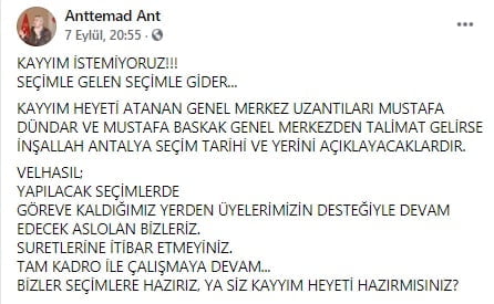 Mevcut yönetimdeki başkan Mustafa DÜNDAR hakkında sosyal medyada paylaşım yapan ve ihraç edilen eski başkan Mustafa DEĞİRMENCİ, DÜNDAR için ‘kayyım’ ifadesini kullanırken, kendi çıkardıkları başkan adayının sosyal medyada açıkladığı şekli ile,  DEĞİRMENCİ’nin görevi tevdi etmesi ise asıl kayyımın kim olduğunun göstergesi olarak ortaya çıkardı.