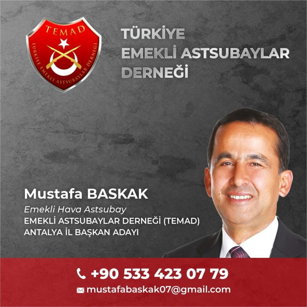 Bu gün Antalya’da ayrışan ve bölünen emekli astsubaylar, ayrı ayrı yerleri mesken etmiş durumda. Bir grup TEMAD lokaline giderken, yaşı ilerlemiş başka bir grup Orduevinde toplanmakta, başka bir grup ise dışarıdaki kahvehane tarzı yerlerde bir araya gelmektedir. Bu bölünmüşlüğe son verilmeli ve Antalya’da yeniden birlik olunması için birleştirici gücü olan Mustafa BASKAK’ın seçilmesi ve Antalya’daki emekli astsubayları tek çatı altında toplaması gerekmektedir.