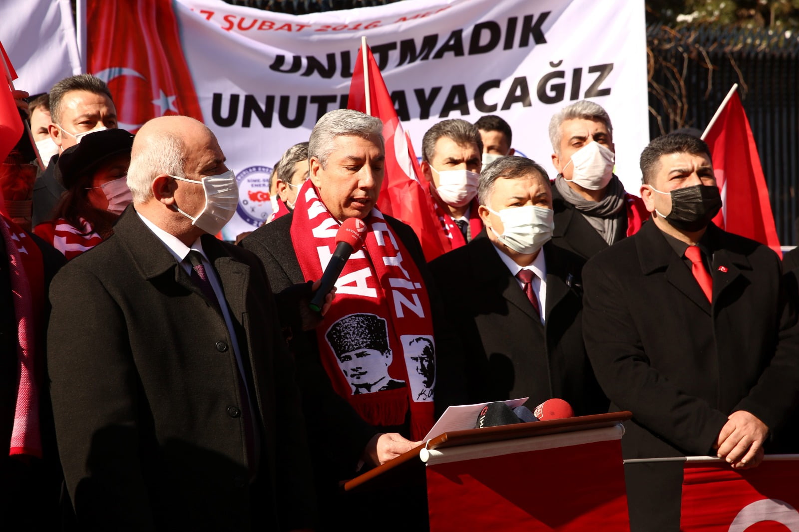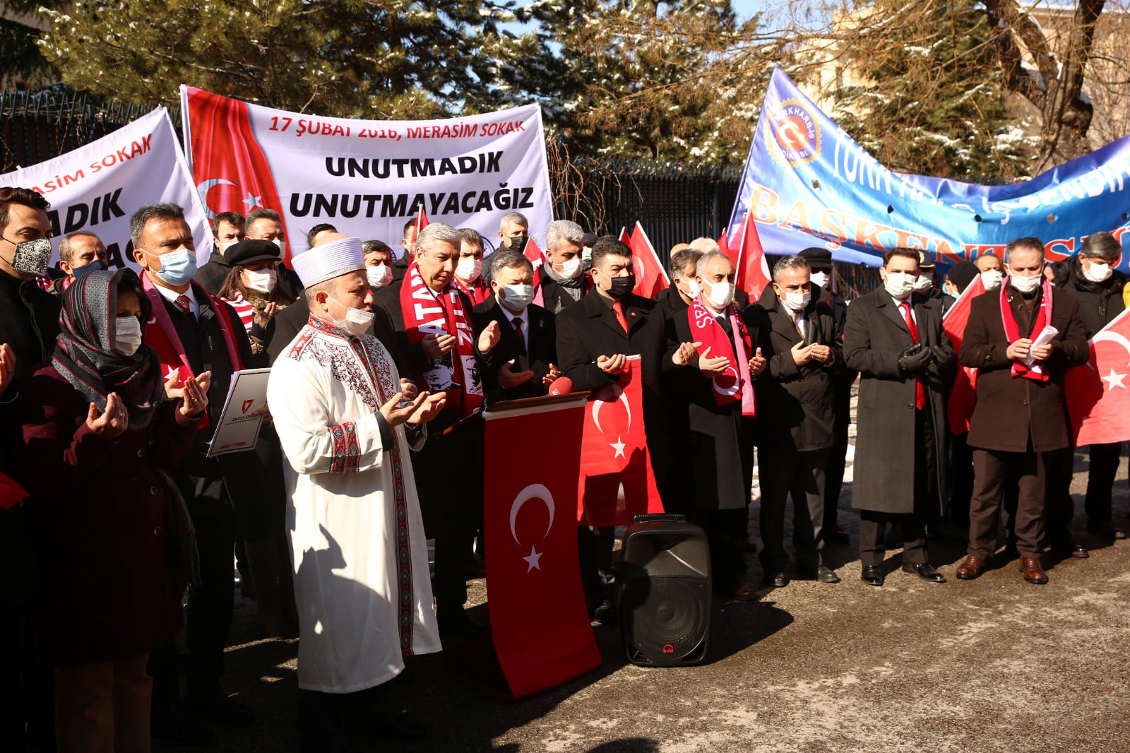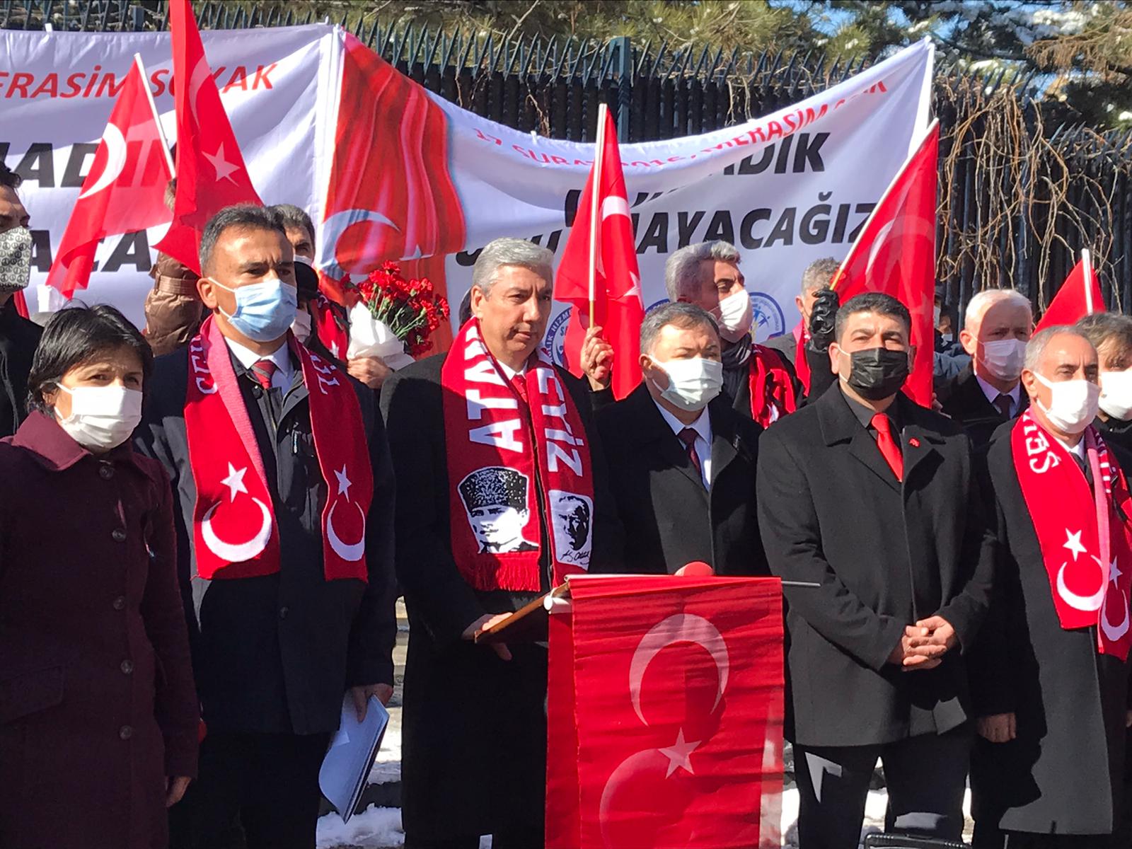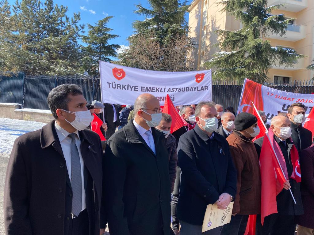 Türkiye Emekli Astsubaylar Derneği Genel Başkanı Hamza Dürgen, grup adına yaptığı basın açıklamasında, Türk Silahlı Kuvvetlerinde sendikal faaliyette bulunan sivil toplum kuruluşları ve dernek olarak, Merasim Sokak’ta servis araçlarına yönelik terör saldırısında şehit edilen mesai arkadaşları ile tüm şehitleri anmak ve menfur saldırıyı şiddetle kınamak için toplandıklarını söyledi.