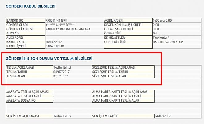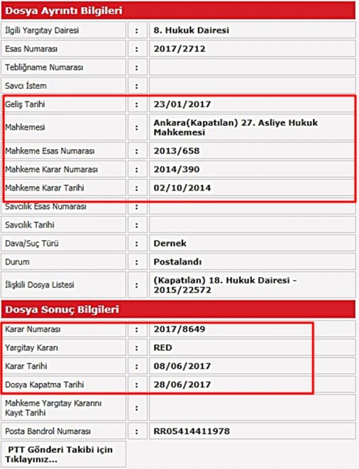 Yargıtay 8. Hukuk Dairesinin kararı posta bandrol numarası ile sorgulandığında RED Kararının 30 Haziran 2016 tarihihnde postaya verildiği ve  4 Temmuz 2017 tarihinde resmi olarak TEMAD Yetkililerine tebliğ edildiği ortaya çıktı.