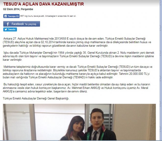 Türkiye Emekli Astsubaylar Derneği (TEMAD) resmi internet sitesinde, 02 Ekim 2104 tarihinde “kazandık” diye duyurduğu TESUD davasında Yargıtay maalesef son noktayı koydu ve Yargıtay 8’inci Hukuk Dairesi TEMAD avukatlarının itirazı redderek kesin kararı verdi. Söz konusu “RED KARARI”  ile TEMAD, TESUD davasını kesin olarak kaybetmiş oldu.