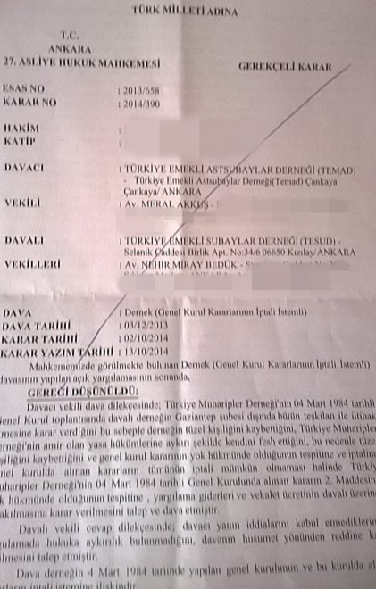 75 bin üyesi bulunan ve emekli astsubay Ahmet Keser’in başkanı olduğu TEMAD ile 15 bin üyesi olan ve emekli Hava Korgeneral Erdoğan Karakuş’un başkanı olduğu TESUD’u karşı karşıya getiren sürecin başında 4 Mart 1984’te alınan bir karar yer alıyor. O gün derneğin lağvedilmesiyle Gaziantep şubesi dışındaki tüm mal varlığı subayların derneği TESUD’a geçmişti. Bu karar 29 yıl sonra yargıya taşındı.